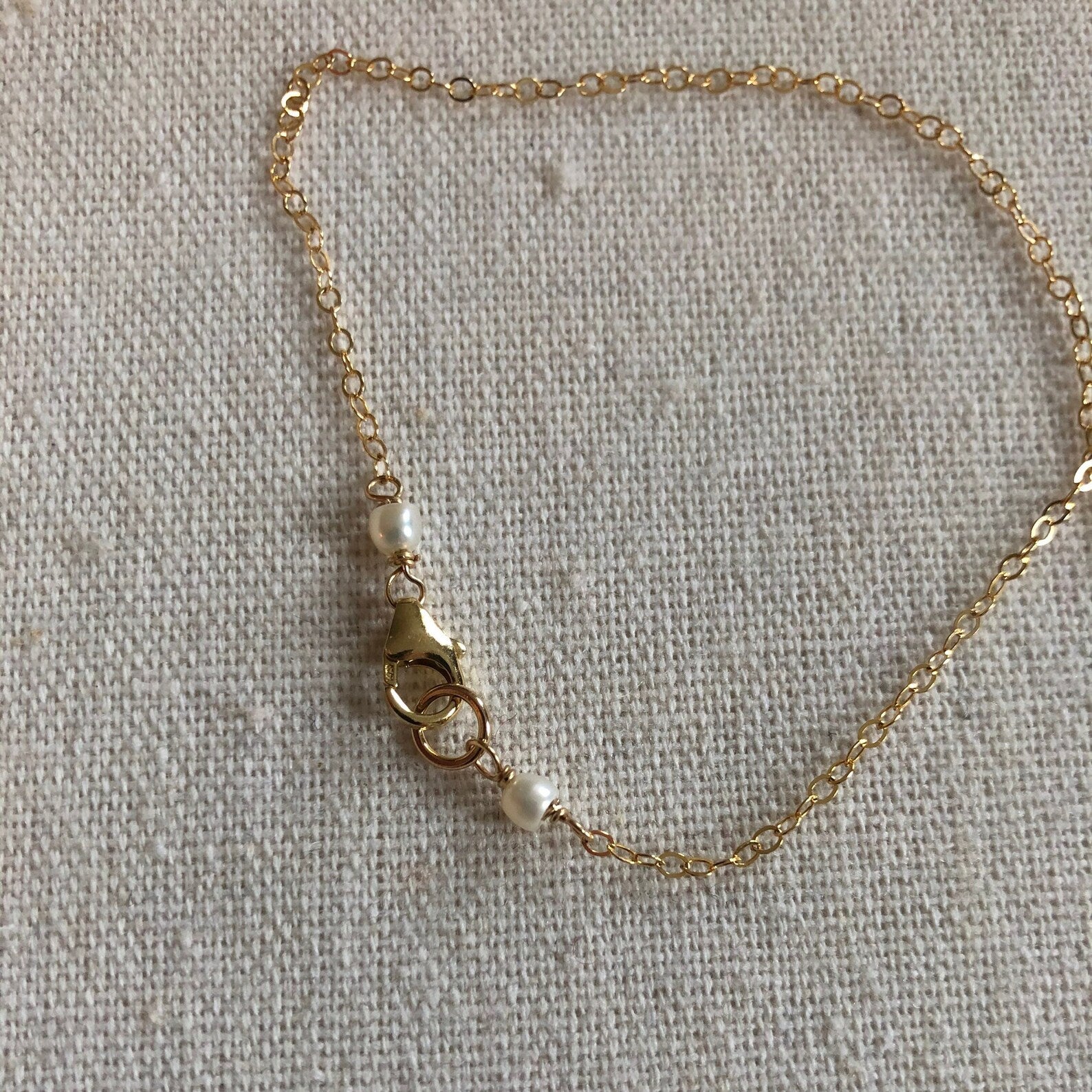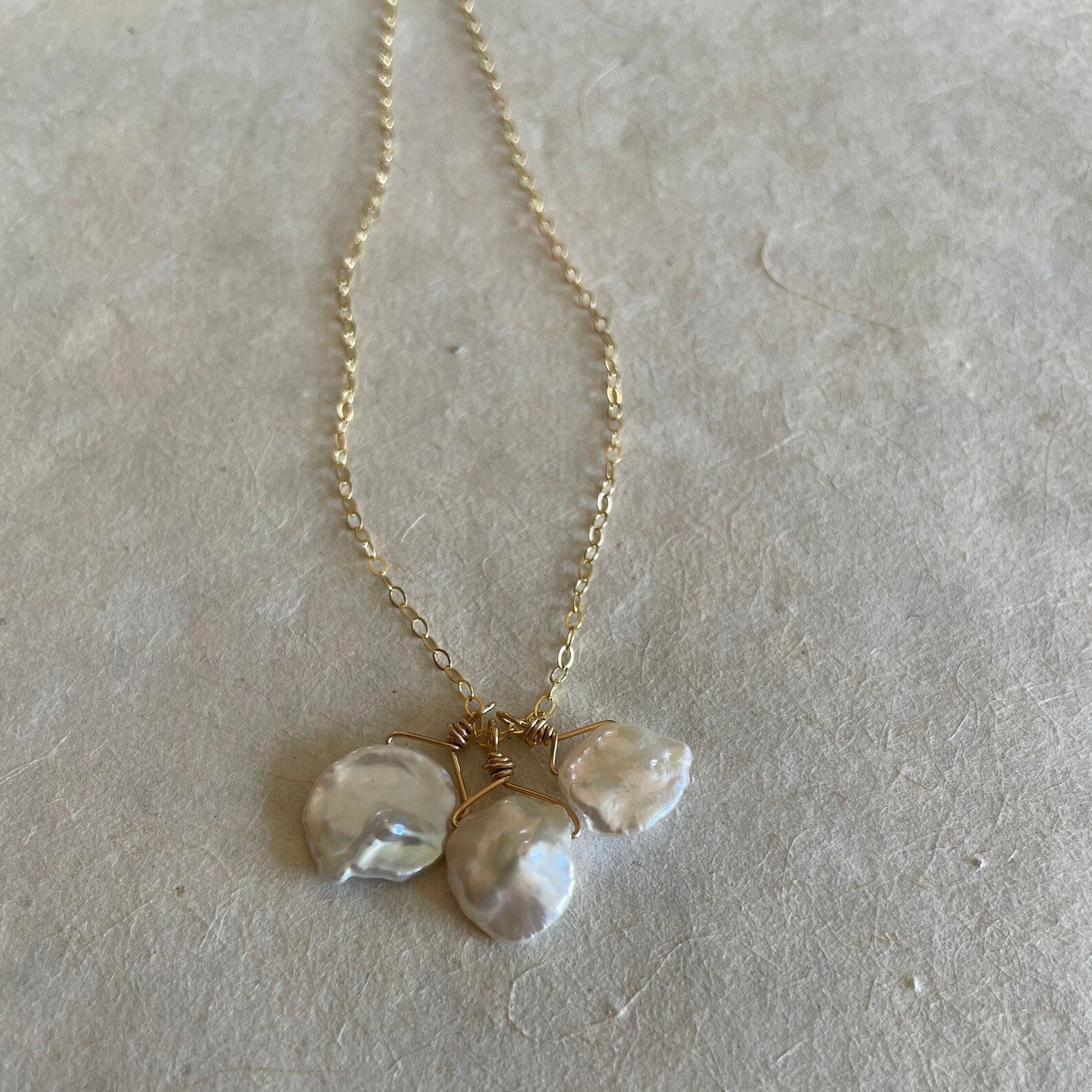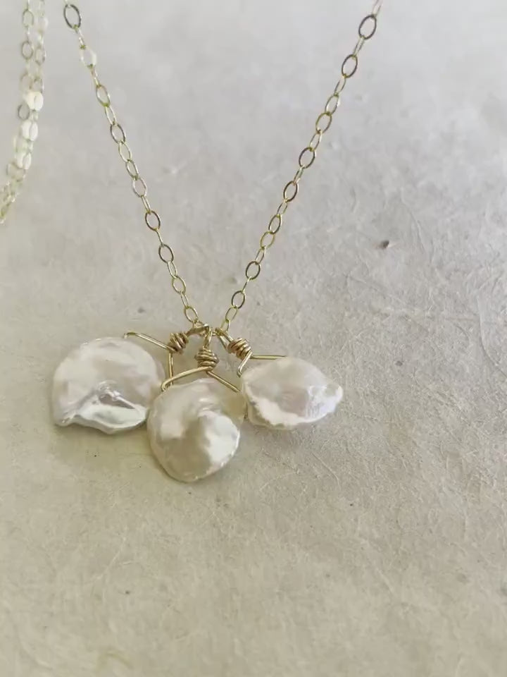 A unique, organically shaped keshi fresh water pearl is hand wrapped to the chain with 14k gold filled wire. The pearls are held by 14k gold chain that is very sparkly in the light, and a 14k gold filled lobster claw as the clasp.