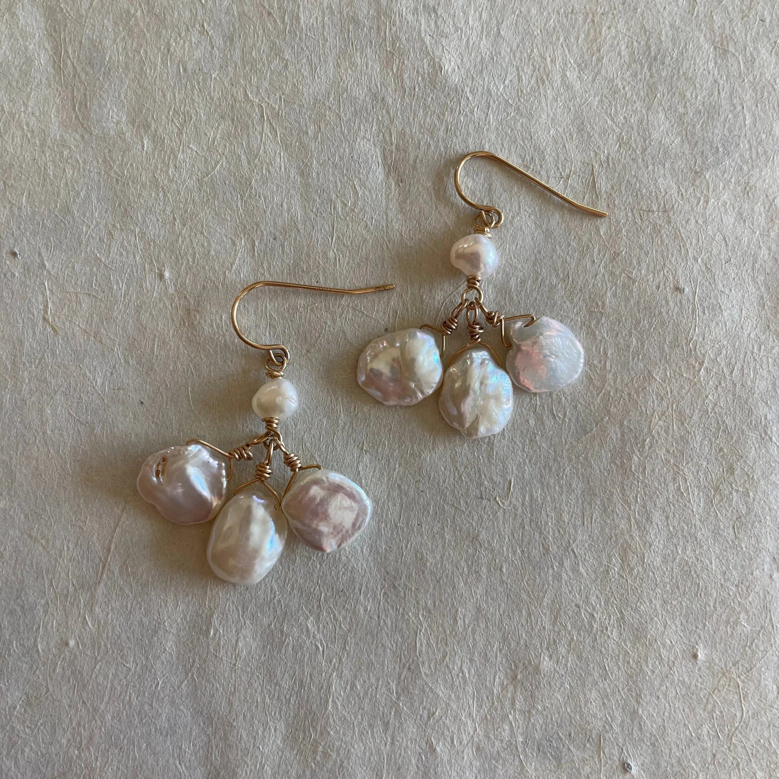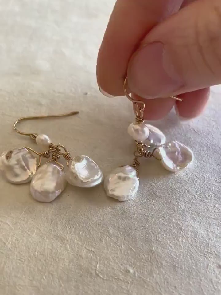 These dancing keshi pearl earrings have so much movement, they are very fun to wear! Each keshi pearl is one of a kind and uniquely shaped. They are wire wrapped together and accented with a fresh water pearl.