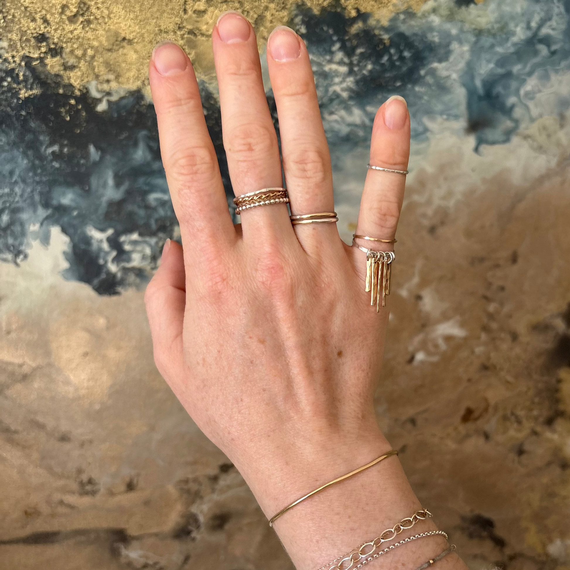 Add a playful touch to your days with the Finger Fringe Ring—a whimsical, one-of-a-kind accent for those who embrace interruptions as reminders to savor life. Crafted from recycled USA sterling silver or 14k gold filled, this fringe ring is intentionally sized slightly larger to encourage delightful movement. To ensure a secure fit, we include a tiny stopper ring in your exact size to keep it from slipping off your finger.