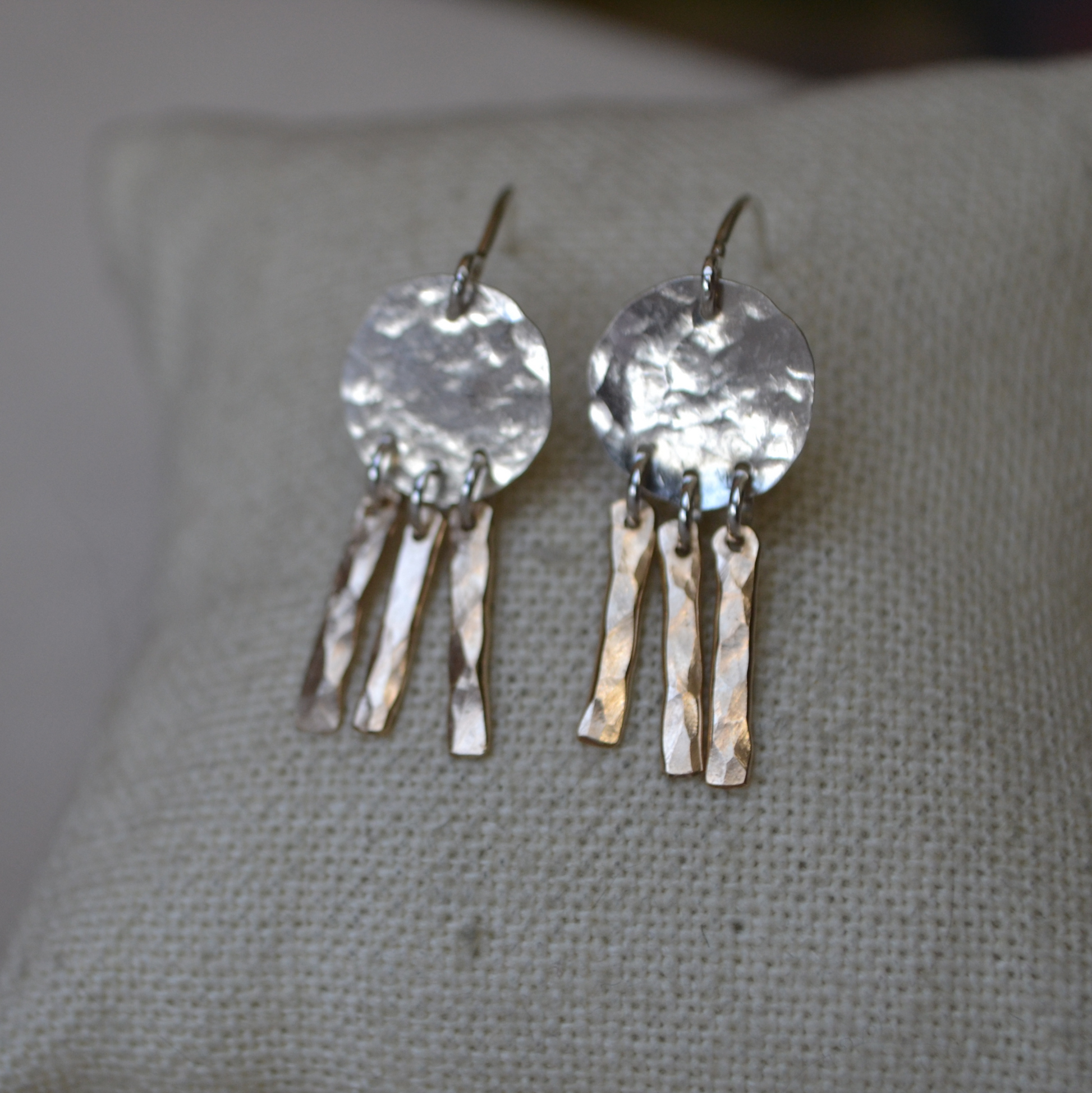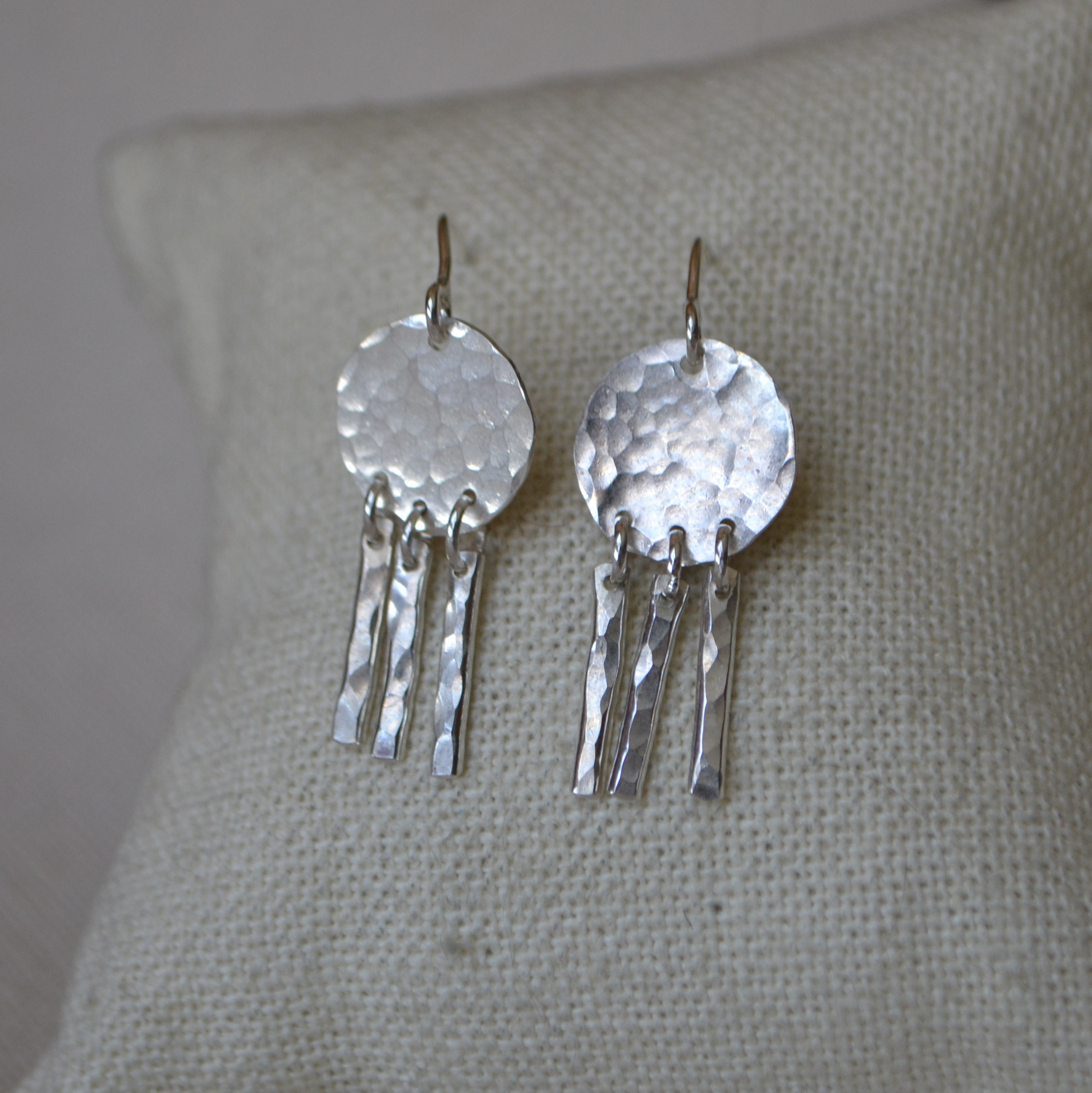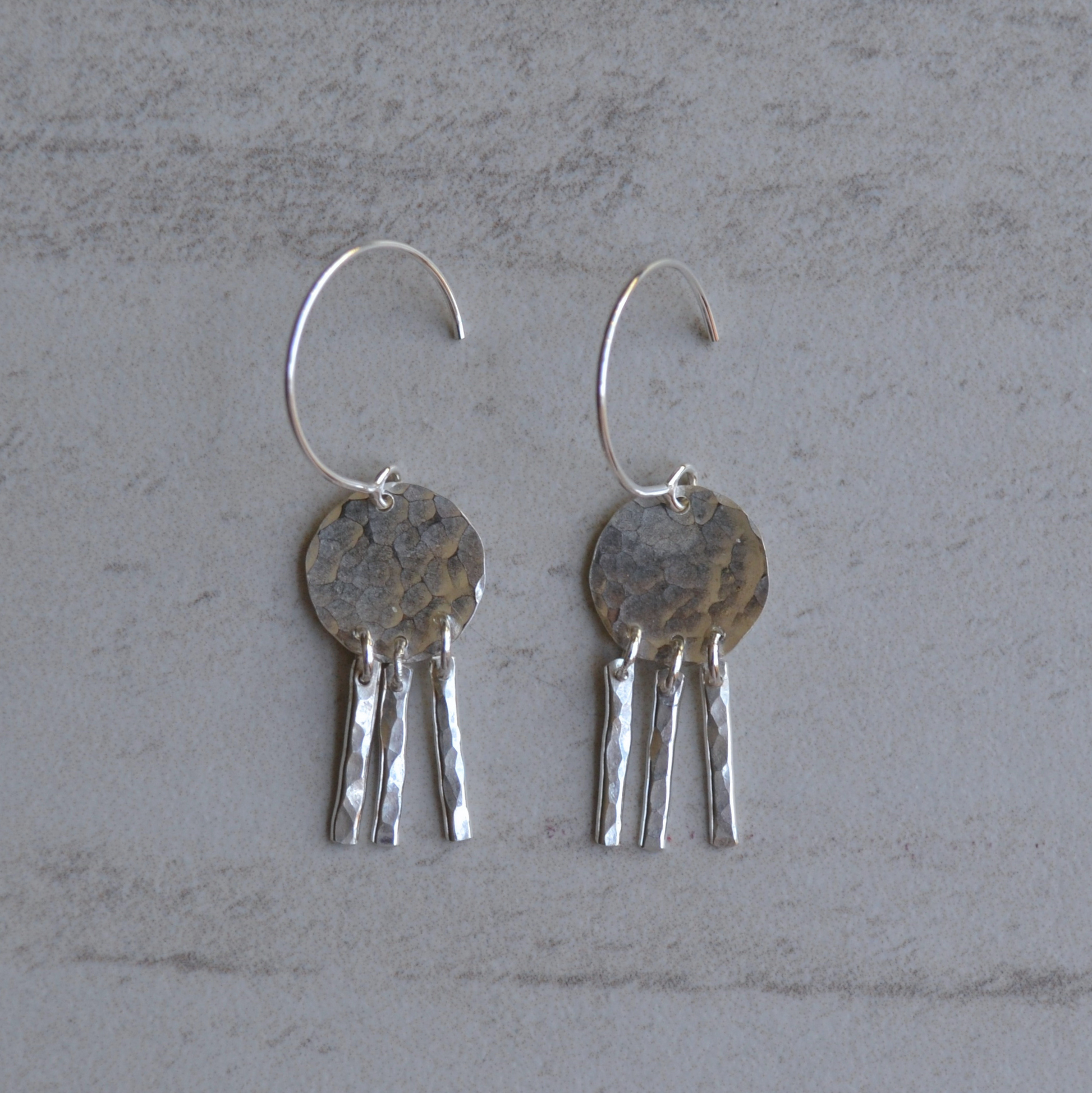 Each earring is made by hammering a recycled mini sterling silver disk or a 14k gold filled disk until my desired texture is achieved. Here I am shooting for the texture of the moon. I create the little fringes by hammering recycled sterling silver wire flat, sawing to length and filing away the rough edges by hand. I then make little holes in the fringe and the moon and create jump rings to attach all my little pieces together. I solder the jump rings shut so everyone is secure, and solder a post for earrings.