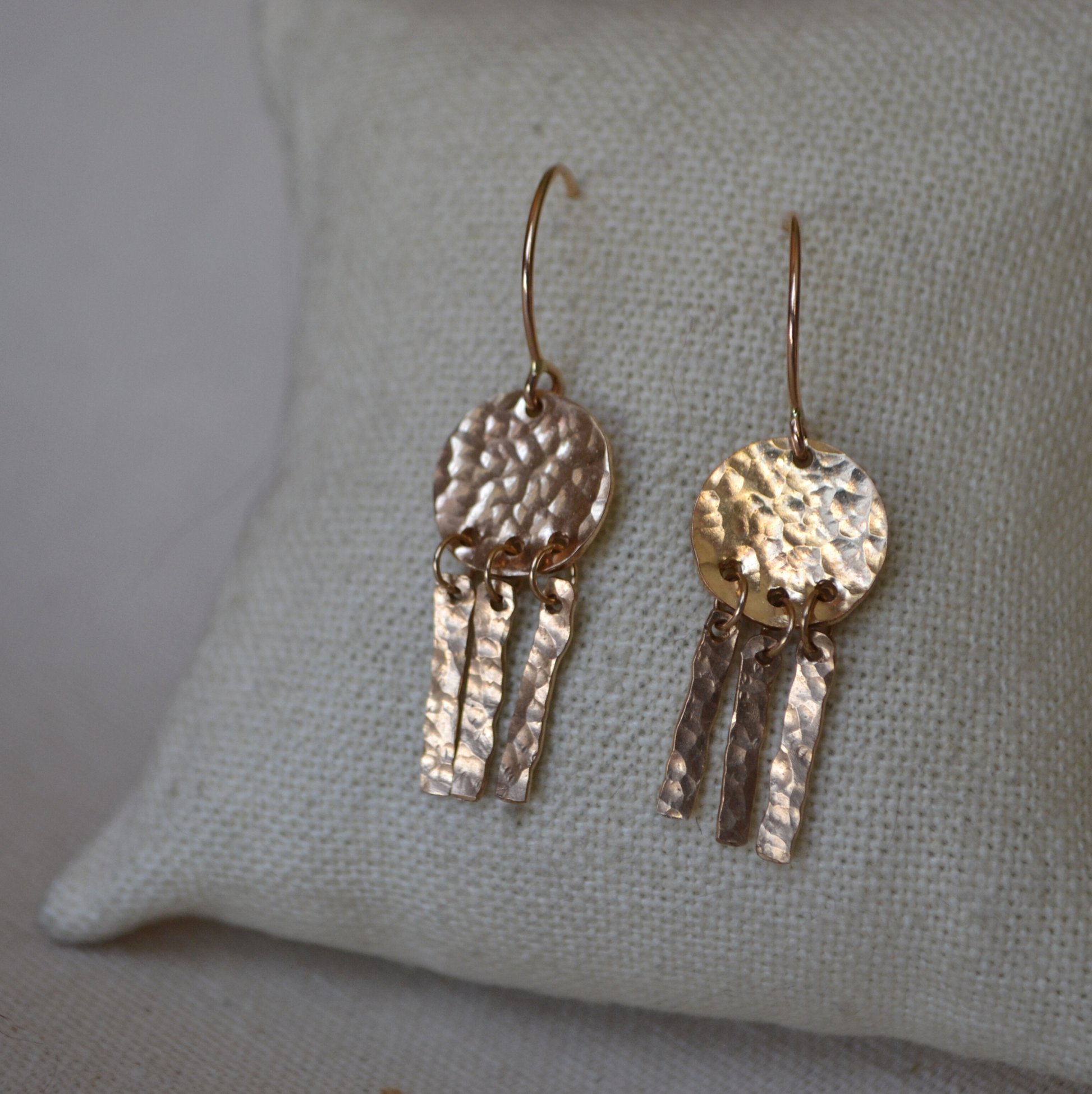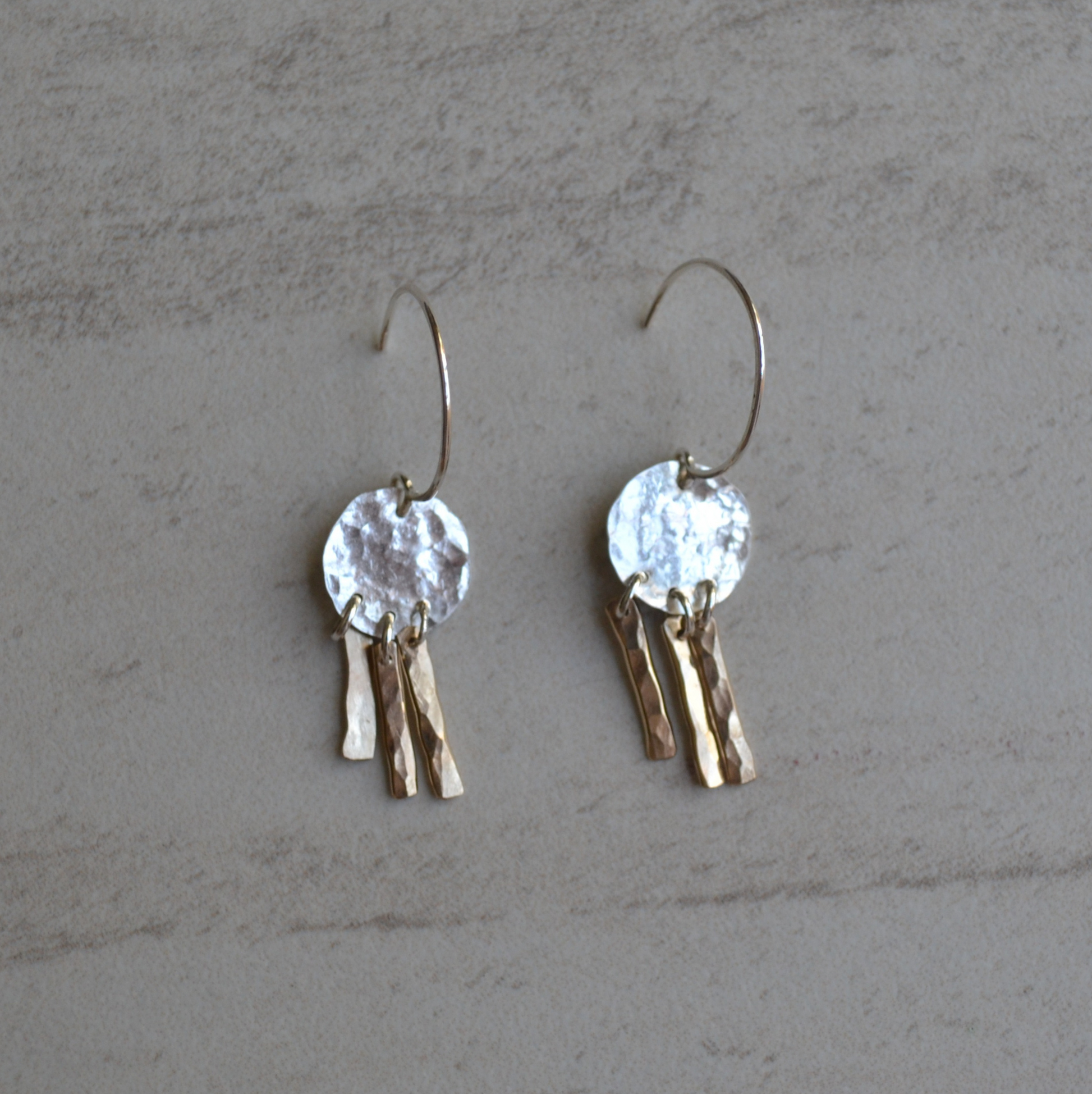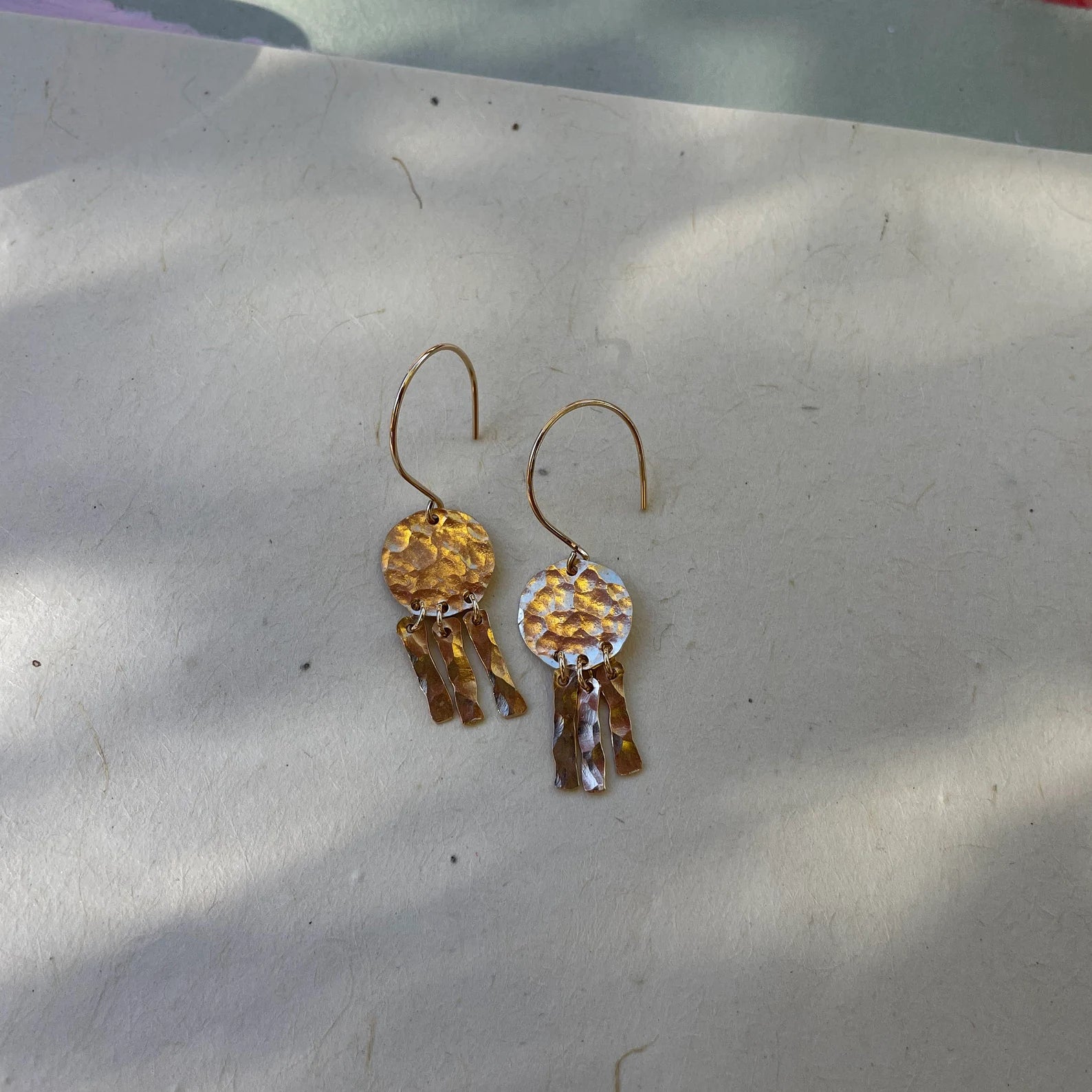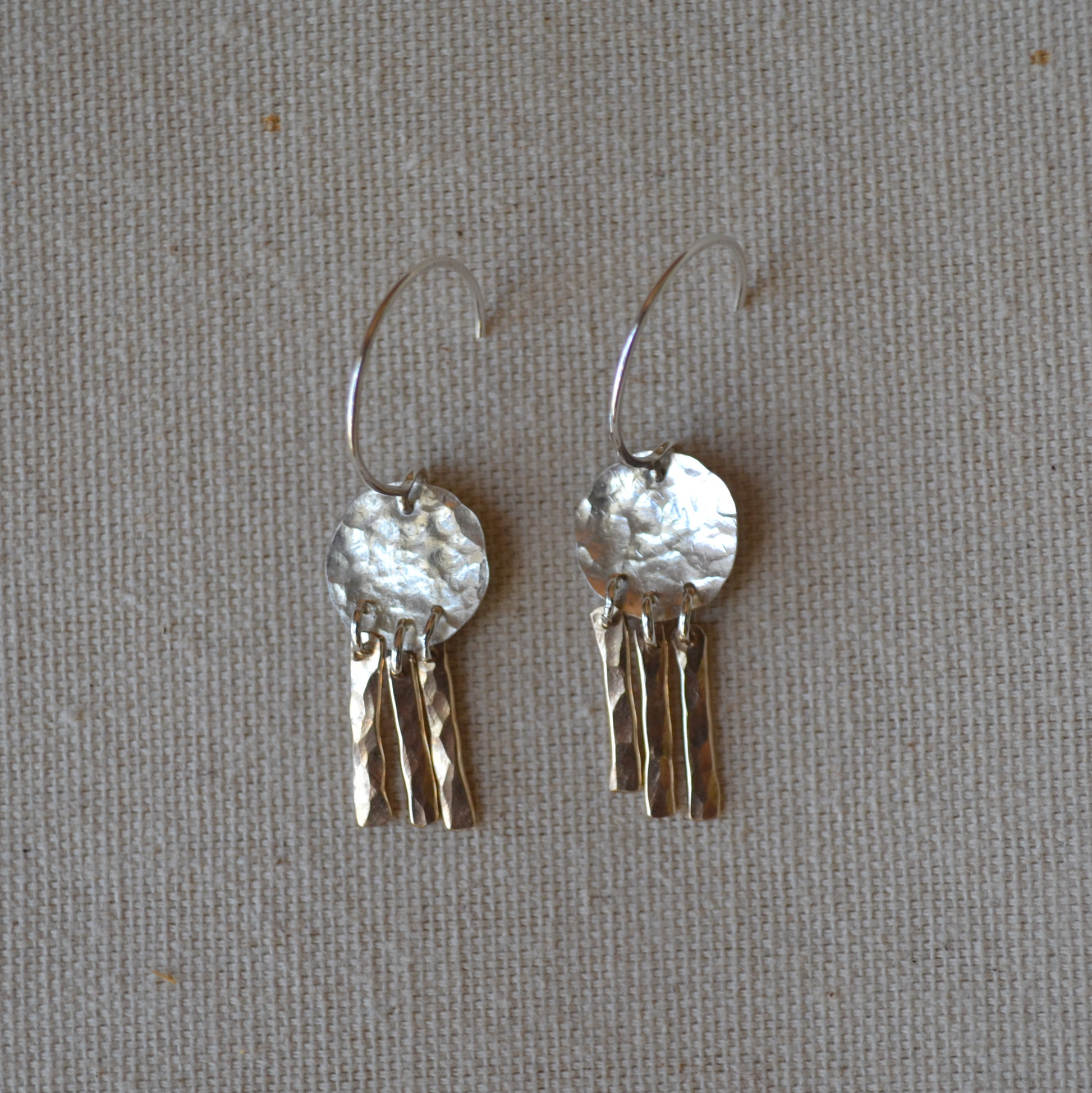 Each earring is made by hammering a recycled mini sterling silver disk or a 14k gold filled disk until my desired texture is achieved. Here I am shooting for the texture of the moon. I create the little fringes by hammering recycled sterling silver wire flat, sawing to length and filing away the rough edges by hand. I then make little holes in the fringe and the moon and create jump rings to attach all my little pieces together. I solder the jump rings shut so everyone is secure, and solder a post for earrings.
